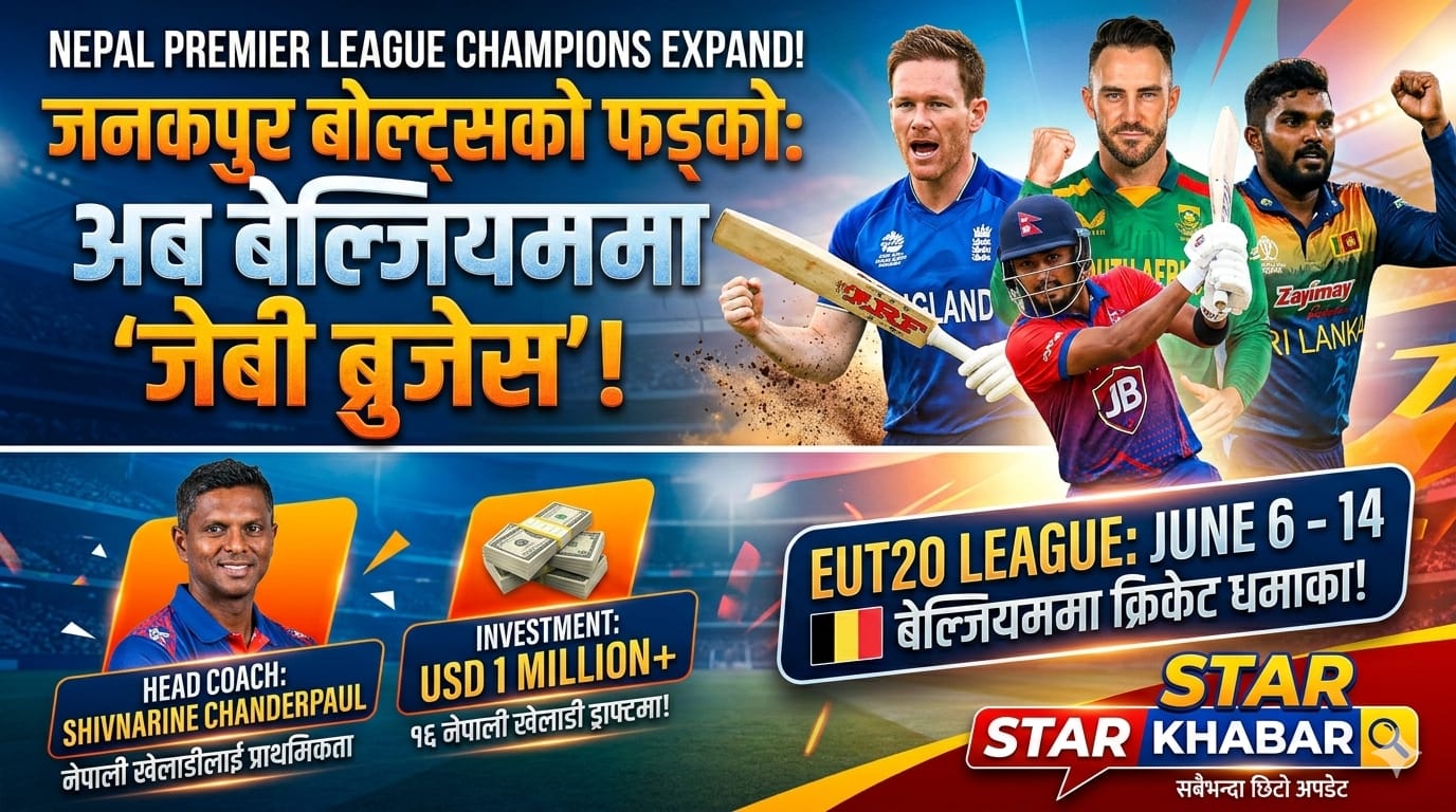 नेपाल प्रिमियर लिग (NPL) को पहिलो संस्करणको ऐतिहासिक विजेता टोली जनकपुर बोल्ट्सले आफ्नो व्यावसायिक यात्रालाई अन्तर्राष्ट्रिय स्तरमा विस्तार गरेको छ। जनकपुर बोल्ट्सले बेल्जियममा आयोजना हुन लागेको ‘ईयू टी-२०’ (EUT20) लिगमा नयाँ टिम खरिद गरेको छ, जसको नाम ‘जेबी ब्रुजेस’ (JB Bruges) राखिएको छ।